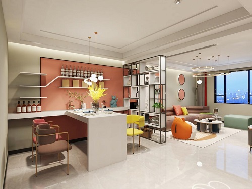 橙粉色的沙發背景墻,給室內增添了暖意和甜美,與小清新的家居擺設相處,和諧而自然。