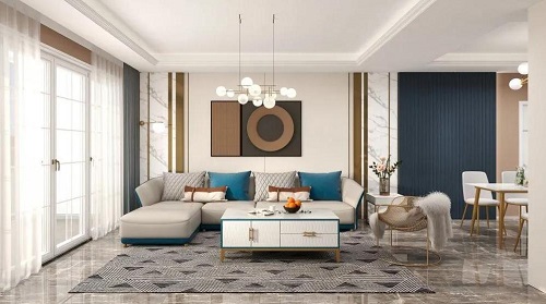 藍、橙、白三色勾勒的背景墻,很有層次感,時尚個性。一幅可以延伸室內空間感的裝飾畫,引人遐想,同時也凸顯客廳的美感。