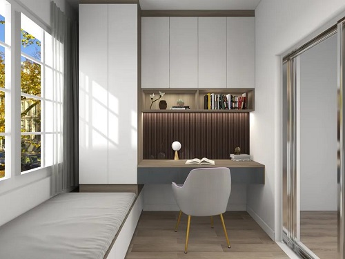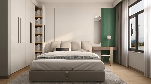 到頂?shù)囊鹿裨O(shè)計(jì),內(nèi)側(cè)設(shè)計(jì)成隱藏書(shū)柜,滿(mǎn)足業(yè)主睡前閱讀的需求,窗邊的梳妝臺(tái),偶爾可以充當(dāng)書(shū)桌,來(lái)滿(mǎn)足隨身辦公的需求。
